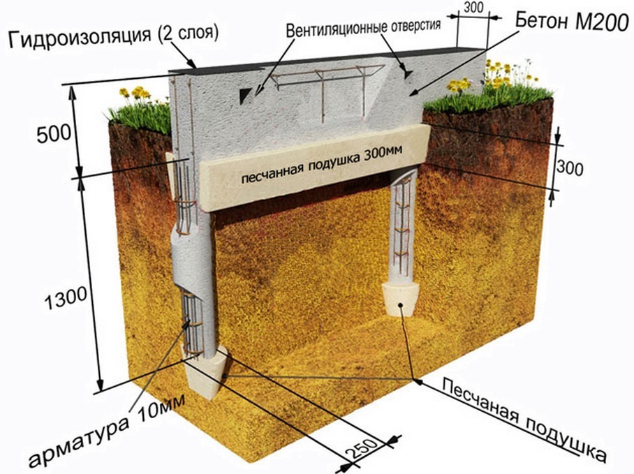 Устройство и схема ленточного фундамента на бетонных сваях.